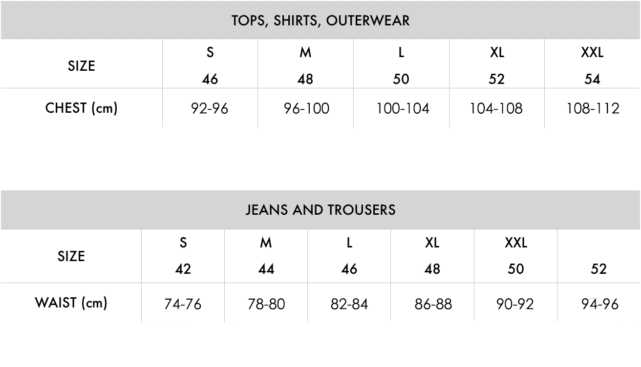 Model’s height 187, he’s wearing a size L / 50 TOP, EU 32 / IT 46 BOTTOM